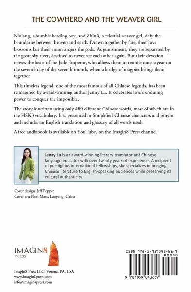 Niulang, a humble herding boy, and Zhinü, a celestial weaver girl, defy the boundaries between heaven and earth. Drawn together by fate, their love blossoms but their union angers the gods. As punishment, they are separated by the great sky river, destined to never see each other again. But their devotion moves the heart of the Jade Emperor, who allows them to reunite once a year on the seventh day of the seventh month, when a bridge of magpies brings them together. This timeless legend, one of the most famous of all Chinese legends, has been reimagined by award-winning author Jenny Lu. It celebrates love's enduring power to conquer the impossible. The story is written using only 489 different Chinese words, most of which are in the HSK3 vocabulary. It is presented in Simplified Chinese characters and pinyin and includes an English translation and glossary of all words used. A free audiobook is available on YouTube, on the Imagin8 Press channel.