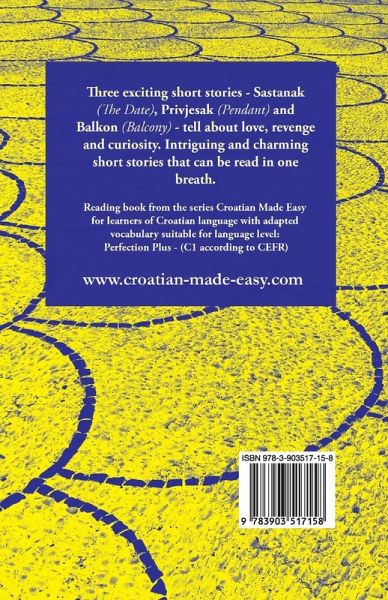 The Date / Sastanak (2. Edition) from the series 'Croatian Made Easy' is a reader for learners of the Croatian language. It consists of three short stories as well as the English introduction and vocabulary list at the end of the book. Level 5: Perfection Plus C1 (GERS) = Advanced High (ACTFL) Description: Three exciting short stories - The Date / Sastanak, Pendant / Privjesak and Balcony / Balkon - are about love, revenge and curiosity. "The Date / Sastanak" tells about how a woman saves her marriage, in "Pendant / Privjesak" a nice old lady tells about the break-in at her home, in "Balcony / Balkon" a neighbor believes to have seen a corpse on the balcony next door. Three intriguing and charming short stories with surprising punch lines that can be read in one breath. This reading book is part of the book series CROATIAN MADE EASY which offers textbooks, reading books, audio books, interactive e-books with audio, videos and other media as well as useful tips for learning Croatian as a foreign language. For more information about the book series and other publications on learning Croatian, please visit our homepage.
