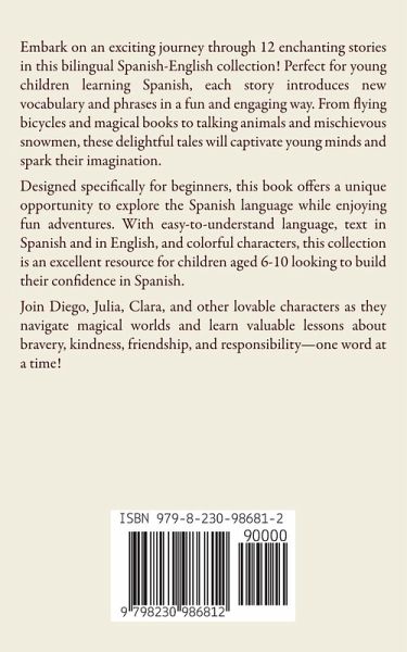 Embark on an exciting journey through 12 enchanting stories in this bilingual Spanish-English collection! Perfect for young children learning Spanish, each story introduces new vocabulary and phrases in a fun and engaging way. From flying bicycles and magical books to talking animals and mischievous snowmen, these delightful tales will captivate young minds and spark their imagination. Designed specifically for beginners, this book offers a unique opportunity to explore the Spanish language while enjoying fun adventures. With easy-to-understand language, text in Spanish and in English, and colorful characters, this collection is an excellent resource for children aged 6-10 looking to build their confidence in Spanish. Join Diego, Julia, Clara, and other lovable characters as they navigate magical worlds and learn valuable lessons about bravery, kindness, friendship, and responsibility-one word at a time! Perfect for home reading or classroom use.