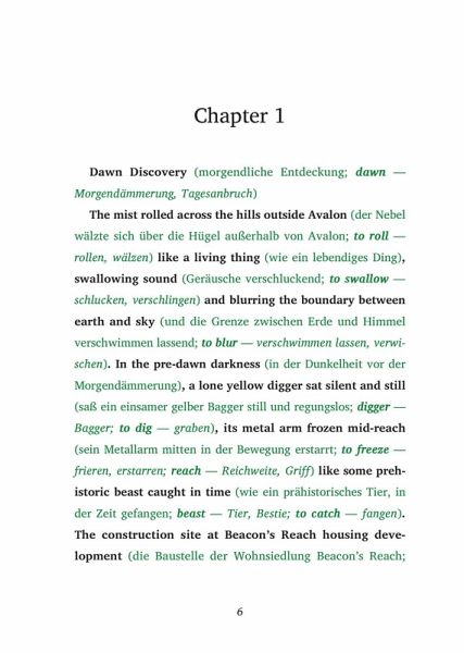 Leseprobe: https://easyoriginal.com/leseproben/DE88.pdf Innovative Frank-Lesemethode: https://easyoriginal.com/frank-lesemethode/ The Druid's Whisper - Das Flüstern des DruidenVergessen Sie alles, was Sie über die Vergangenheit zu wissen glauben.Im Nebel von Avalon, wo Legenden und Realität seit jeher verschwimmen, wird auf einer Baustelle eine Entdeckung gemacht, die Geschichte schreiben könnte: ein vergessener Steinkreis, Zeuge uralter Rituale. Doch die Ehrfurcht weicht dem Entsetzen, als im Morgengrauen in der Mitte des Kreises eine Leiche gefunden wird. Es ist kein gewöhnlicher Mord. Die Inszenierung ist perfekt, theatralisch, wie ein grausames Echo aus einer längst vergangenen Zeit. Ein Opfer, dargebracht nach druidischem Ritus? Oder die eiskalte Botschaft eines modernen Mörders, der sich hinter den Mythen der Vergangenheit versteckt? Für Detective Inspector Rhiannon Blythe beginnt ein Wettlauf gegen die Zeit. Jeder, der mit den Steinen in Verbindung steht, ist verdächtig.Was, wenn der größte Schock nicht der Mörder ist, sondern die Wahrheit, die der Steinkreis selbst verbirgt?Tauchen Sie ein in The Druid's Whisper - ein Verbrechen so alt wie die Legenden selbst und eine Wahrheit, die alles verändert. Sie werden dieses Buch nicht mehr aus der Hand legen können!Entdecken Sie eine effektive Methode zum Englischlernen mit unserer Reihe "Frank-Lesemethode: Moderne Lektüre A2-B1"! Diese innovative Sammlung bietet Texte, die ursprünglich für B2-Niveau verfasst und dann speziell für A2-B1 Lernende aufbereitet wurden.Besonderheiten der Reihe: - Ursprünglich für B2-Niveau geschriebene, spannende Geschichten - Sorgfältig für A2-B1 Lernende angepasst, ohne den Text zu kürzenZweisprachige Texte mit nahtlos integrierter Unterstützung: - Englischer Originaltext - Deutsche Übersetzung und Erklärungen direkt im Text in Klammern - Übersetzung und Kommentare fügen sich natürlich in den Lesefluss ein - Reichhaltiger B2-Wortschatz, zugänglich gemacht für A2-B1 NiveauVorteile dieser Methode für A2-B1 Lernende: - Zugang zu authentischen B2-Texten ohne Überforderung - Erweiterung des Wortschatzes und der Grammatikkenntnisse im Kontext - Verbesserung des Leseverständnisses durch gezielte Unterstützung - Steigerung der Motivation durch Bewältigung anspruchsvoller TexteJedes Buch ermöglicht Ihnen: - Ihr Leseverständnis mit vollständigen B2-Texten zu verbessern - Ihren Wortschatz deutlich über das A2-B1 Niveau hinaus zu erweitern - Komplexere grammatikalische Strukturen in einem verständlichen Kontext kennenzulernen - Tiefere Einblicke in die englische Kultur zu gewinnenPerfekt für: - A2-B1 Lernende, die ihr Englisch effektiv verbessern möchten - Englischlernende, die von authentischen Texten profitieren wollen - Leser, die unterhaltsame und zugleich lehrreiche Lektüre suchenDiese Reihe bietet Ihnen die einzigartige Möglichkeit, vollständige Texte auf B2-Niveau zu lesen, die speziell für Ihr Lernniveau aufbereitet wurden. Erleben Sie, wie Sie mit jedem Buch Ihre Englischkenntnisse spürbar verbessern!
