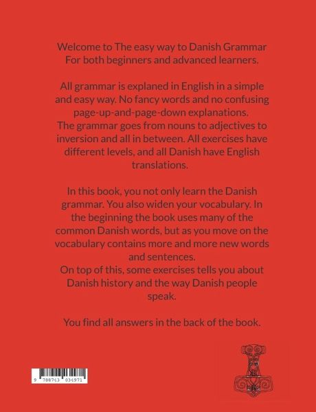 Learn Danish grammar in an easy but through way. For each part of the grammar, you find exercises for both beginners and advanced learners.All grammar is explained in English. It is explained in a short, easy but though way, followed by exercises. The exercises are in Danish with English translations.You not only learn the Danish grammar. Many of the exercises teach Danish history and on top of that, the vocabulary slowly widens and so does yours.You find all answers in the back of the book.