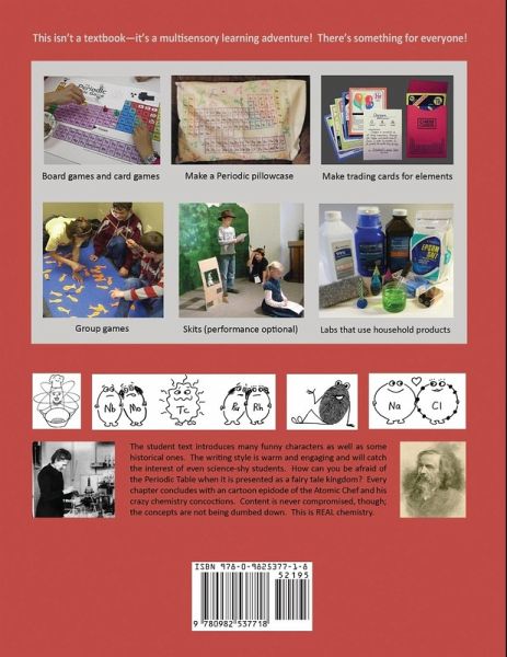 An introduction to chemistry for ages 9 to 14. This is a full curriculum and includes both an 80-page student text and a100-page teacher's section providing patterns and instructions for a wide variety of games, crafts, activities, songs, skits and experiments. The writing style is warm and engaging and often includes whimsical humor and cartoons. The topics covered include the structure of atoms, how atoms bond (covalent, ionic, metallic), electron orbitals and shells, the octect rule, the history of the Periodic Table, and an overview of each family group on the Periodic Table (metals, non-metals,noble gases, alkali metals, etc.). After using this curriculum, the student is ready to tackle high school chemistry without fear. (The book is also available as a digital product on the author's website: www.ellenjmchenry.com.)