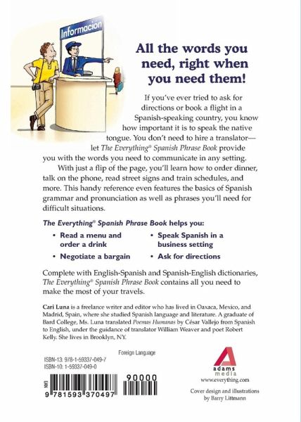 With the increase in travel to Spanish-speaking countries as well as the rise in the Latino population in the United States, a growing number of people are in need of a quick reference to help them communicate. Sadly, most Spanish reference books contain outdated phrases organized in a manner that make it difficult to find the right words for the right situation. The Everything Spanish Phrase Book remedies these shortcomings with a practical, real-world approach to language learning that is both quick and easy to use. From ordering dinner and asking for directions to working and communicating in Latino communities, this handy guide provides readers with all they need as ellos hablan español in any setting.Organized by situation, The Everything Spanish Phrase Book contains the right words for:Traveling and making reservations Dining and shopping Speaking Spanish in a business setting Working with the Latino community Fully indexed and complete with a pronunciation guide and helpful dictionaries, The Everything Spanish Phrase Book is the ideal resource for business or pleasure.
