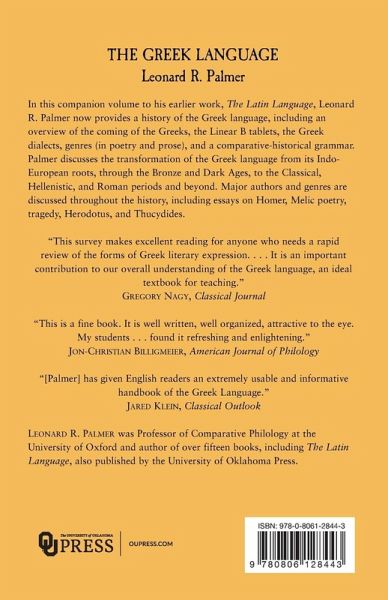 In this companion volume to his earlier work, The Latin Language, Leonard R. Palmer now provides a history of The Greek Language, including an overview of the coming of the Greeks, the Linear B. Tablets, the Greek dialects, genres (in poetry and prose), and a comparative-historical grammar. Palmer discusses the transformation of the Greek language from its Indo-European roots, through the Bronze and Dark Ages, to the Classical, Hellenistic, and Roman periods and beyond. Major authors and genres are discussed throughout the history, including essays on Homer, Melic poetry, tragedy, Herodotus and Thucydides.