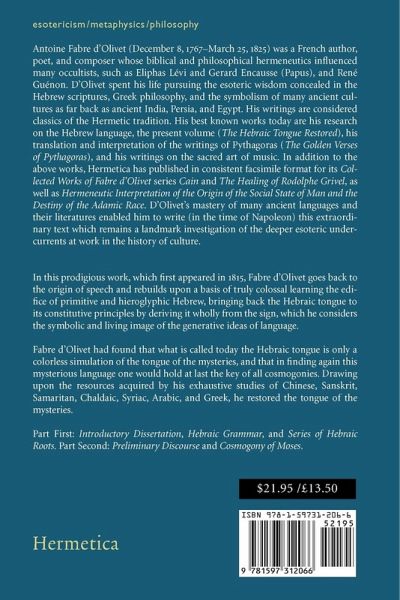 Antoine Fabre d'Olivet (December 8, 1767-March 25, 1825) was a French author, poet, and composer whose biblical and philosophical hermeneutics in?uenced many occultists, such as Eliphas Lévi and Gerard Encausse (Papus), and René Guénon. D'Olivet spent his life pursuing the esoteric wisdom concealed in the Hebrew scriptures, Greek philosophy, and the symbolism of many ancient cultures as far back as ancient India, Persia, and Egypt. His writings are considered classics of the Hermetic tradition. His best known works today are his research on the Hebrew language, the present volume (The Hebraic Tongue Restored), his translation and interpretation of the writings of Pythagoras (The Golden Verses of Pythagoras), and his writings on the sacred art of music. In addition to the above works, Hermetica has published in consistent facsimile format for its Collected Works of Fabre d'Olivet series Cain and The Healing of Rodolphe Grivel, as well as Hermeneutic Interpretation of the Origin of the Social State of Man and the Destiny of the Adamic Race. D'Olivet's mastery of many ancient languages and their literatures enabled him to write (in the time of Napoleon) this extraordinary text which remains a landmark investigation of the deeper esoteric undercurrents at work in the history of culture. In this prodigious work, which first appeared in 1815, Fabre d'Olivet goes back to the origin of speech and rebuilds upon a basis of truly colossal learning the edifice of primitive and hieroglyphic Hebrew, bringing back the Hebraic tongue to its constitutive principles by deriving it wholly from the sign, which he considers the symbolic and living image of the generative ideas of language. Fabre d'Olivet had found that what is called today the Hebraic tongue is only a colorless simulation of the tongue of the mysteries, and that in finding again this mysterious language one would hold at last the key of all cosmogonies. Drawing upon the resources acquired by his exhaustive studies of Chinese, Sanskrit, Samaritan, Chaldaic, Syriac, Arabic, and Greek, he restored the tongue of the mysteries. Part First: Introductory Dissertation, Hebraic Grammar, and Series of Hebraic Roots. Part Second: Preliminary Discourse and Cosmogony of Moses.