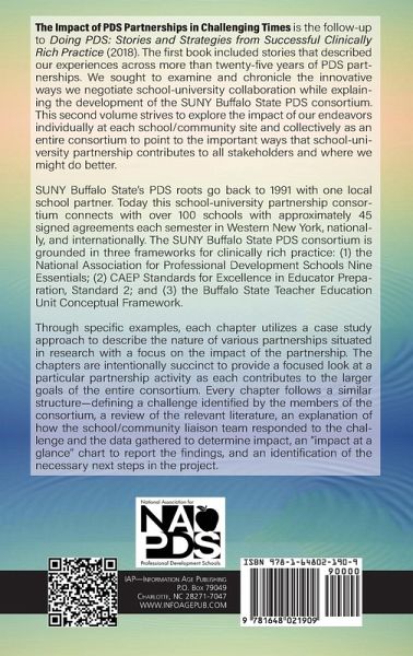 The Impact of PDS Partnerships in Challenging Times is the follow up to Doing PDS: Stories and Strategies from Successful Clinically Rich Practice (2018). The first book included stories that described our experiences across more than twenty-five years of PDS partnerships. We sought to examine and chronicle the innovative ways we negotiate school-university collaboration while explaining the development of the SUNY Buffalo State PDS consortium. This second volume strives to explore the impact of our endeavors individually at each school/community site and collectively as an entire consortium to point to the important ways that school-university partnership contributes to all stakeholders and where we might do better. SUNY Buffalo State's PDS roots go back to 1991 with one local school partner. Today this school-university partnership consortium connects with over 100 schools with approximately 45 signed agreements each semester in Western New York, nationally, and internationally. The SUNY Buffalo State PDS consortium is grounded in three frameworks for clinically rich practice: (a) the National Association for Professional Development Schools Nine Essentials (Brindley, Field, & Lesson, 2008); (b) CAEP Standards for Excellence in Educator Preparation, Standard 2 (http://caepnet.org/standards/standard-2, 2018); and (c) the Buffalo State Teacher Education Unit Conceptual Framework (https://epp.buffalostate.edu/conceptual-framework, 2018). Through specific examples, each chapter utilizes a case study approach to describe the nature of various partnerships situated in research with a focus on the impact of the partnership. The chapters are intentionally succinct to provide a focused look at a particular partnership activity as each contributes to the larger goals of the entire consortium. Every chapter follows a similar structure - defining a challenge identified by the members of the consortium, a review of the relevant literature, an explanation of how the school/community liaison team responded to the challenge and the data gathered to determine impact, an "impact at a glance" chart to report the findings, and an identification of the necessary next steps in the project.