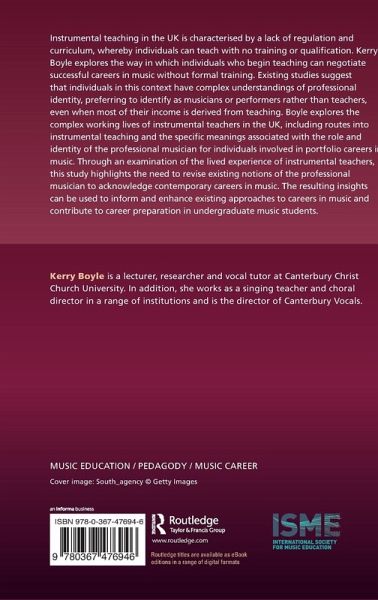 Instrumental teaching in the UK is characterised by a lack of regulation and curriculum, whereby individuals can teach with no training or qualification. Kerry Boyle explores the way in which individuals who begin teaching can negotiate successful careers in music without formal training. Existing studies suggest that individuals in this context have complex understandings of professional identity, preferring to identify as musicians or performers rather than teachers, even when most of their income is derived from teaching. Boyle explores the complex working lives of instrumental teachers in the UK, including routes into instrumental teaching and the specific meanings associated with the role and identity of the professional musician for individuals involved in portfolio careers in music. Through an examination of the lived experience of instrumental teachers, this study highlights the need to revise existing notions of the professional musician to acknowledge contemporary careers in music. The resulting insights can be used to inform and enhance existing approaches to careers in music and contribute to career preparation in undergraduate music students.