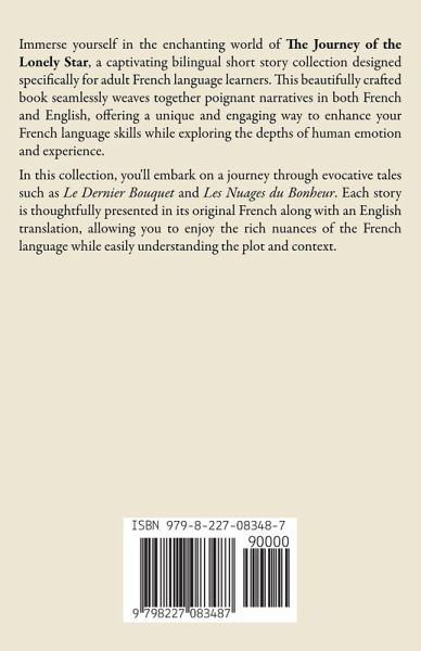 Immerse yourself in the enchanting world of The Journey of the Lonely Star, a captivating bilingual short story collection designed specifically for adult French language learners. This beautifully crafted book seamlessly weaves together poignant narratives in both French and English, offering a unique and engaging way to enhance your French language skills while exploring the depths of human emotion and experience. In this collection, you'll embark on a journey through evocative tales such as Le Dernier Bouquet and Les Nuages du Bonheur. Each story is thoughtfully presented in its original French along with an English translation, allowing you to enjoy the rich nuances of the French language while easily understanding the plot and context.