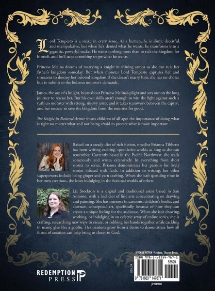 Lord Tempesto is a snake in every sense. As a human, he is slimy, deceitful, and manipulative, but when he's denied what he wants, he transforms into a gigantic, powerful snake. He wants nothing more than to rule the kingdom himself, and he'll stop at nothing to get what he wants. Princess Melina is meant to rule her father's kingdom someday, but she doesn't want to do it alone. However, the search for a noble suitor brings a monster to the palace gates. When monster Lord Tempesto captures her and threatens to devour her beloved kingdom if she doesn't marry him, she has no choice but to submit to the repulsive monster's demands. James, the son of a knight, hears about Princess Melina's plight and sets out on the long journey to rescue her. But his own skills aren't enough to win the fight against such a ruthless, powerful monster, and it takes teamwork between the captive and her rescuer to save the kingdom from the monster for good. The Knight in Battered Armor shows children of all ages the importance of doing what is right no matter what and not being afraid to protect what is most important.