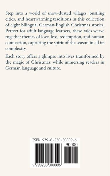 Step into a world of snow-dusted villages, bustling cities, and heartwarming traditions in this collection of eight bilingual German-English Christmas stories. Perfect for adult language learners, these tales weave together themes of love, loss, redemption, and human connection, capturing the spirit of the season in all its complexity. Each story offers a glimpse into lives transformed by the magic of Christmas, while immersing readers in German language and culture.