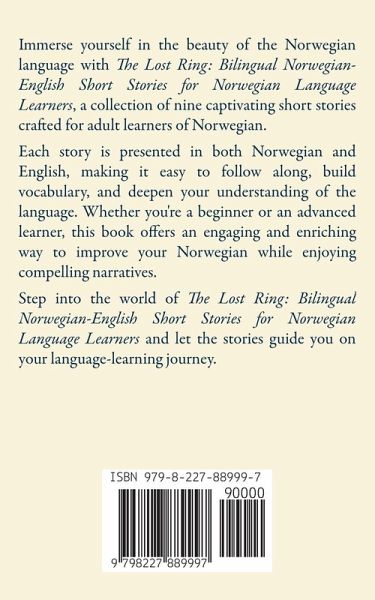 Immerse yourself in the beauty of the Norwegian language with The Lost Ring: Bilingual Norwegian-English Short Stories for Norwegian Language Learners, a collection of nine captivating short stories crafted for adult learners of Norwegian. Each story is presented in both Norwegian and English, making it easy to follow along, build vocabulary, and deepen your understanding of the language. Whether you're a beginner or an advanced learner, this book offers an engaging and enriching way to improve your Norwegian while enjoying compelling narratives. Step into the world of The Lost Ring: Bilingual Norwegian-English Short Stories for Norwegian Language Learners and let the stories guide you on your language-learning journey.