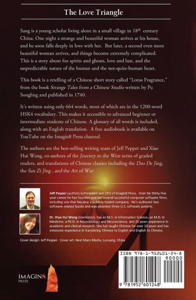 Sang is a young scholar living alone in a small village in 18th century China. One night a strange and beautiful woman arrives at his house, and he soon falls deeply in love with her. But later, a second even more beautiful woman arrives, and things become extremely complicated. This is a story about fox spirits and ghosts, love and lust, and the unpredictable nature of the human and the not-quite-human heart. This book is a retelling of a Chinese short story called "Lotus Fragrance," from the book Strange Tales from a Chinese Studio written by Pu Songling and published in 1740. It's written using the 1200-word HSK4 vocabulary, making it accessible to advanced beginner or intermediate students of Chinese. A glossary of all words is included, along with an English translation. A free audiobook is available on YouTube on the Imagin8 Press channel. The authors are the best-selling writing team of Jeff Pepper and Xiao Hui Wang, co-authors of the Journey to the West series of graded readers, and translations of Chinese classics including the Dao De Jing, the San Zi Jing , and the Art of War.