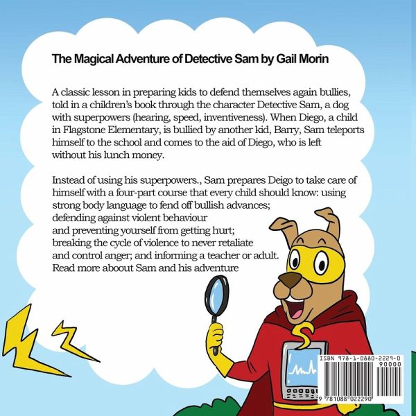 A classic lesson in preparing kids to defend themselves against bullies, told in a children's book through the character Detective Sam, a dog with superpowers (hearing, speed, inventiveness). When Diego, a child in Flagstone Elementary, is bullied by another kid, Barry, Sam teleports himself to the school and comes to the aid of Diego, who is left without his lunch money. Instead of using his superpowers, Sam prepares Diego to take care of himself with a four-part course that every child should know: using strong body language to fend off bullish advances; defending against violent behavior…mehr