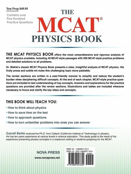 Comprehensive, Rigorous Prep for MCAT Physics. Revised for MCAT 2015. The MCAT Physics Book offers the most comprehensive and rigorous analysis of MCAT physics available. Including, * 49 MCAT-style passages * 500 MCAT-style practice problems and detailed solutions to all problems. Illustrations and tables are included wherever necessary to focus and clarify key ideas and concepts. Dr. Biehle's classic MCAT Physics Book presents a clear, insightful analysis of MCAT physics. His lively prose and subtle wit make this challenging topic more palatable. Dr. Biehle received his Ph.D. from Caltech (California Institute of Technology) in physics. He has ten years experience at various levels in science education. The MCAT Physics Book is a result of his experience presenting physics concepts in a classroom setting to students preparing for the MCAT.