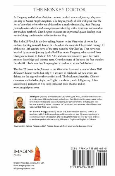 As Tangseng and his three disciples continue on their westward journey, they meet the king of Scarlet Purple Kingdom. The king is gravely ill, sick with grief over the loss of one of his wives who was abducted by a nearby demon king. Sun Wukong pretends to be a doctor and attempts to cure the king with a treatment not found in any medical textbook. Then he goes to rescue the imprisoned queen, leading to an earth-shaking confrontation with the demon king. This is the 23rd book in the best-selling Journey to the West series of stories for students learning to read Chinese. It is based on the events in Chapters 68 through 71 of the epic 16th century novel of the same name by Wu Chen'en. That novel was inspired by an actual journey by the Buddhist monk Tangseng, who traveled from Chang'an westward to India in 629 A.D. and returned seventeen years later with priceless knowledge and spiritual texts. Over the course of the book the four travelers face the 81 tribulations that Tangseng had to endure to attain Buddhahood. The first 23 books in the Journey to the West series have used a total of about 2000 different Chinese words, but only 916 are used in this book. All new words are defined on the page where they are first used. The book uses Simplified Chinese characters and includes pinyin, an English translation, and a full glossary. A free audiobook is available on YouTube's Imagin8 Press channel and on www.imagin8press.com.