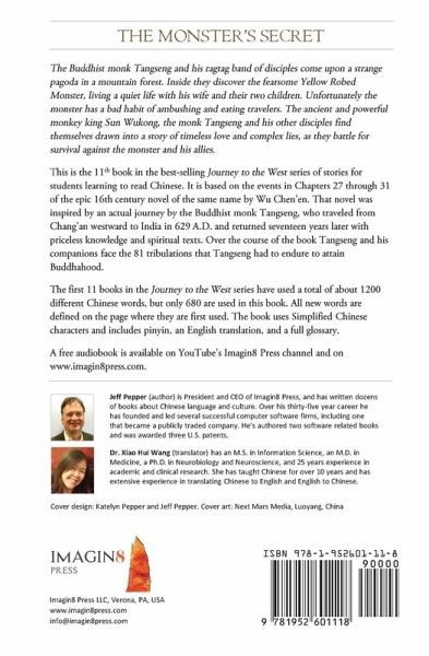 The Buddhist monk Tangseng and his ragtag band of disciples come upon a strange pagoda in a mountain forest. Inside they discover the fearsome Yellow Robed Monster, living a quiet life with his wife and their two children. Unfortunately the monster has a bad habit of ambushing and eating travelers. The ancient and powerful monkey king Sun Wukong, the monk Tangseng and his other disciples find themselves drawn into a story of timeless love and complex lies, as they battle for survival against the monster and his allies. This is the 11th book in the best-selling The Journey to the West series of stories for students learning to read Chinese. It is based on the epic 16th century novel of the same name by Wu Chen'en. That novel was inspired by an actual journey by the Buddhist monk Tangseng, who traveled from Chang'an westward to India in 629 A.D. and returned seventeen years later with priceless knowledge and spiritual texts. Over the course of the book Tangseng and his companions face the 81 tribulations that Tangseng had to endure to attain Buddhahood. The story is written, as much as possible, using the 1200-word vocabulary of HSK4. It is presented in Simplified Chinese characters and pinyin, and includes an English version and glossary. A free audiobook is available on YouTube's Imagin8 Press channel and also on www.imagin8press.com.