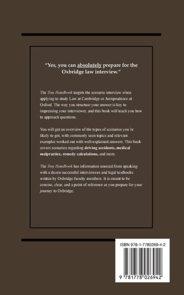 You may have read that you don't have to know any legal concepts to ace the Oxbridge scenario law interview. That may be true, but only if you can structure your thinking well and articulate it on the spot. But what's the "right" way to think? They say there's not much you can do to prepare, is that true? No. You can prepare, and to optimize your chances of impressing the tutors, you should. Tutors test for the right Oxbridge student by using several main legal ideas, and being familiar with them will absolutely help you. Those ideas include:Breach of Duty Causation Hypotheticals Murder Remedies And more Before you crack open the Tiny Handbook, be ready to jump right into scenarios based on past interviews. Every part of the best answer will be explained to you concisely. --- This book targets the scenario interview when applying to study Law at Cambridge or Jurisprudence at Oxford. The way you structure your answer is key to impressing your interviewer, and the Tiny Handbook will teach you how to approach questions. You will get an overview of the types of scenarios you're likely to get, with commonly seen topics and relevant examples worked out with well-explained answers. This book covers scenarios regarding driving accidents, medical malpractice, and more. The Tiny Handbook has information sourced from speaking with a dozen successful interviewees and legal textbooks written by Oxbridge faculty members. It is meant to be concise, clear, and a point of reference as you prepare for your journey to Oxbridge. Emphasis on "tiny"! You can easily carry this book around with you anywhere and take notes in the margins.