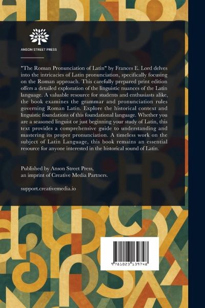 "The Roman Pronunciation of Latin" by Frances E. Lord delves into the intricacies of Latin pronunciation, specifically focusing on the Roman approach. This carefully prepared print edition offers a detailed exploration of the linguistic nuances of the Latin language. A valuable resource for students and enthusiasts alike, the book examines the grammar and pronunciation rules governing Roman Latin. Explore the historical context and linguistic foundations of this foundational language. Whether you are a seasoned linguist or just beginning your study of Latin, this text provides a comprehensive guide to understanding and mastering its proper pronunciation. A timeless work on the subject of Latin Language, this book remains an essential resource for anyone interested in the historical sound of Latin. This work has been selected by scholars as being culturally important, and is part of the knowledge base of civilization as we know it. This work is in the public domain in the United States of America, and possibly other nations. Within the United States, you may freely copy and distribute this work, as no entity (individual or corporate) has a copyright on the body of the work. Scholars believe, and we concur, that this work is important enough to be preserved, reproduced, and made generally available to the public. We appreciate your support of the preservation process, and thank you for being an important part of keeping this knowledge alive and relevant.