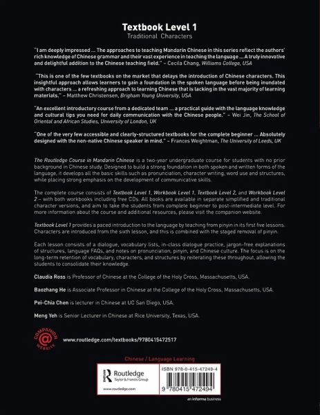 "I am deeply impressed by the pedagogical considerations that Prof. Ross and her team put into the project.The approaches to teaching Mandarin Chinese in this series reflected the authors' rich knowledge of the Chinese grammar and their vast experience in teaching the language. The materials developed are pedagogically well conceived and equally well supported by theories of language learning/teaching. A truly innovative and delightful addition to the Chinese teaching field."- Cecila Chang, Williams College, USA