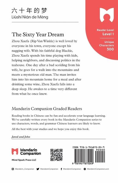Zhou Xuefa (Rip Van Winkle) is well loved by everyone in his town, everyone except his nagging wife. With his faithful dog Blackie, Zhou Xuefa spends his time playing with kids, helping neighbors, and discussing politics in the teahouse. One day after a bad scolding from his wife, he goes for a walk into the mountains and meets a mysterious old man who appears to be from an ancient time. The man invites him into his mountain home for a meal and after drinking some wine, Zhou Xuefa falls into a deep sleep. He awakes to a time very different than what he once knew. Mandarin Companion is a series of easy-to-read novels in Chinese that are fun to read and proven to accelerate language learning. Every book in the Mandarin Companion series is carefully written to use characters, words, and grammar that a learner is likely to know. Level 1 is intended for Chinese learners at an upper-elementary level. Most learners will be able to approach this book after one to two years of formal study, depending on the learner and program. This series is designed to combine simplicity of characters with an easy-to-understand storyline which helps learners to expand their vocabularies and language comprehension abilities. The more they read, the better they will become at reading and grasping the Chinese language.