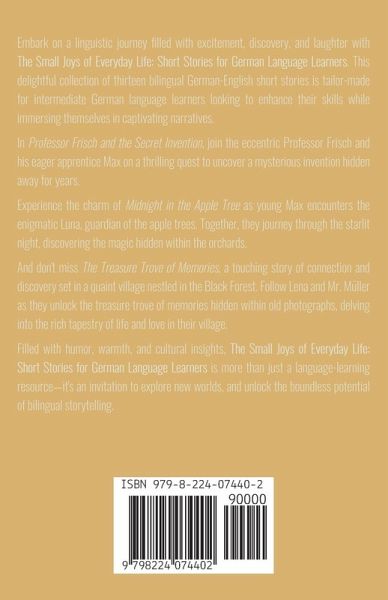 Embark on a linguistic journey filled with excitement, discovery, and laughter with The Small Joys of Everyday Life: Short Stories for German Language Learners. This delightful collection of thirteen bilingual German-English short stories is tailor-made for intermediate German language learners looking to enhance their skills while immersing themselves in captivating narratives. In Professor Frisch and the Secret Invention, join the eccentric Professor Frisch and his eager apprentice Max on a thrilling quest to uncover a mysterious invention hidden away for years. Experience the charm of Midnight in the Apple Tree as young Max encounters the enigmatic Luna, guardian of the apple trees. Together, they journey through the starlit night, discovering the magic hidden within the orchards. And don't miss The Treasure Trove of Memories, a touching story of connection and discovery set in a quaint village nestled in the Black Forest. Follow Lena and Mr. Müller as they unlock the treasure trove of memories hidden within old photographs, delving into the rich tapestry of life and love in their village. Filled with humor, warmth, and cultural insights, The Small Joys of Everyday Life: Short Stories for German Language Learners is more than just a language-learning resource-it's an invitation to explore new worlds, and unlock the boundless potential of bilingual storytelling.