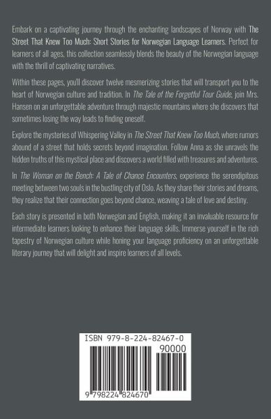 Embark on a captivating journey through the enchanting landscapes of Norway with The Street That Knew Too Much: Short Stories for Norwegian Language Learners. Perfect for learners of all ages, this collection seamlessly blends the beauty of the Norwegian language with the thrill of captivating narratives. Within these pages, you'll discover twelve mesmerizing stories that will transport you to the heart of Norwegian culture and tradition. In The Tale of the Forgetful Tour Guide, join Mrs. Hansen on an unforgettable adventure through majestic mountains where she discovers that sometimes losing the way leads to finding oneself. Explore the mysteries of Whispering Valley in The Street That Knew Too Much, where rumors abound of a street that holds secrets beyond imagination. Follow Anna as she unravels the hidden truths of this mystical place and discovers a world filled with treasures and adventures. In The Woman on the Bench: A Tale of Chance Encounters, experience the serendipitous meeting between two souls in the bustling city of Oslo. As they share their stories and dreams, they realize that their connection goes beyond chance, weaving a tale of love and destiny. Each story is presented in both Norwegian and English, making it an invaluable resource for intermediate learners looking to enhance their language skills. Immerse yourself in the rich tapestry of Norwegian culture while honing your language proficiency on an unforgettable literary journey that will delight and inspire learners of all levels.