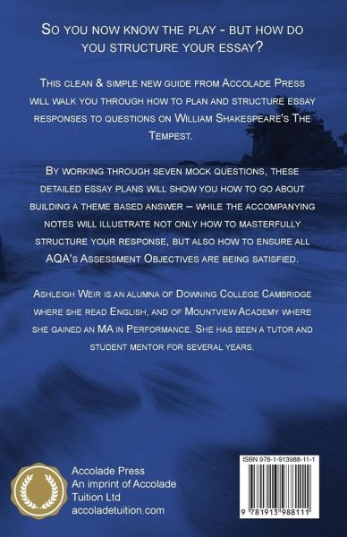 So you now know the play - but how do you structure your essay? This clean & simple new guide from Accolade Press will walk you through how to plan and structure essay responses to questions on William Shakespeare's The Tempest. By working through seven mock questions, these detailed essay plans will show you how to go about building a theme based answer - while the accompanying notes will illustrate not only how to masterfully structure your response, but also how to ensure all AQA's Assessment Objectives are being satisfied. Ashleigh Weir is an alumna of Downing College Cambridge where she read English, and of Mountview Academy where she gained an MA in Performance. She has been a tutor and student mentor for several years.