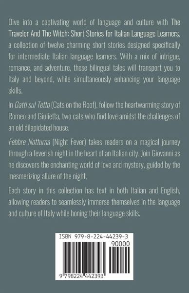 Dive into a captivating world of language and culture with The Traveler And The Witch: Short Stories for Italian Language Learners, a collection of twelve charming short stories designed specifically for intermediate Italian language learners. With a mix of intrigue, romance, and adventure, these bilingual tales will transport you to Italy and beyond, while simultaneously enhancing your language skills. In Gatti sul Tetto (Cats on the Roof), follow the heartwarming story of Romeo and Giulietta, two cats who find love amidst the challenges of an old dilapidated house. Febbre Notturna (Night Fever) takes readers on a magical journey through a feverish night in the heart of an Italian city. Join Giovanni as he discovers the enchanting world of love and mystery, guided by the mesmerizing allure of the night. Each story in this collection has text in both Italian and English, allowing readers to seamlessly immerse themselves in the language and culture of Italy while honing their language skills.