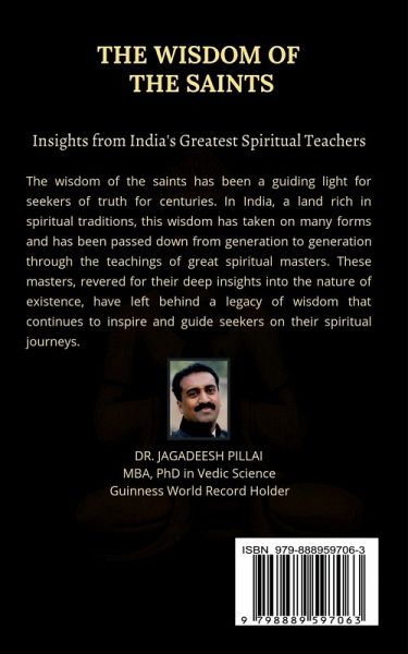 The wisdom of the saints has been a guiding light for seekers of truth for centuries. In India, a land rich in spiritual traditions, this wisdom has taken on many forms and has been passed down from generation to generation through the teachings of great spiritual masters. These masters, revered for their deep insights into the nature of existence, have left behind a legacy of wisdom that continues to inspire and guide seekers on their spiritual journeys. This book, ""The Wisdom of the Saints: Insights from India's Greatest Spiritual Teachers,"" is a celebration of this rich legacy. It brings together the teachings of some of India's most influential spiritual masters, providing readers with a comprehensive overview of the insights and wisdom that these great teachers have offered. From the teachings of Adi Shankara and Ramakrishna, to the philosophy of Mahatma Gandhi and the integral yoga of Sri Aurobindo, this book offers a diverse and comprehensive look at the wisdom of India's spiritual tradition. Whether you are a spiritual seeker, a student of philosophy, or simply someone looking to deepen your understanding of life's great mysteries, this book is for you. It provides a unique opportunity to gain insights into the wisdom and teachings of some of India's greatest spiritual masters and to explore the rich and diverse spiritual traditions that have shaped this land for centuries.