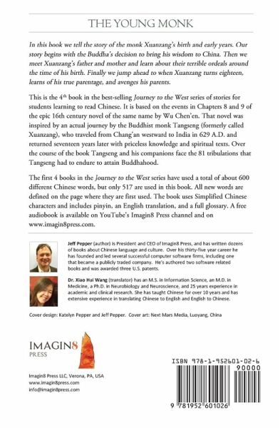 "The Young Monk" is the fourth book in the "Journey to the West" series of stories by Jeff Pepper and Xiao Hui Wang. Other titles include "Rise of the Monkey King", "Trouble in Heaven" and "The Immortal Peaches". In this, the fourth book in the series, we leave the imprisoned Sun Wukong behind, and tell the story of Xuanzang, the monk chosen by the Buddha to undertake the dangerous journey westward to India and bring sacred wisdom back to China. Unlike the previous books which told of Sun Wukong's great adventures (and misadventures) across heaven and earth, this story deals with smaller, human-scale events and the traditional themes of love, loyalty, treachery and revenge. Our story begins with the Buddha's decision to bring his wisdom to China. Then we meet the young couple - Guangrui and Wenjiao - who become Xuanzang's parents. We witness their terrible ordeals around the time of Xuanzang's birth, and we then jump ahead to when he turns eighteen, learns of his true parentage, and avenges his parents. This book is based on chapters 8 and 9 of Journey To The West, an epic novel written in the 16th Century by Wu Chen'en. Journey To The West is loosely based on an actual journey by the Buddhist monk Xuanzang, who traveled from the Chinese city of Chang'an westward to India in 629 A.D. and returned 17 years later with priceless knowledge and texts of Buddhism. Over the course of the book the band of travelers face the 81 tribulations that Xuanzang had to endure to attain Buddhahood. Each book in our Journey to the West series covers a short section of the original 2,000-page novel. The first three books in the series all focus on Sun Wukong, the Monkey King. We tell the story of his birth, his early years, and his adventures in Heaven and Earth that lead, ultimately, to his capture and his centuries-long imprisonment under Five Finger Mountain.The story is written, as much as possible, using the 600 word vocabulary of HSK 3. It is presented in simplified Chinese characters and pinyin, and includes an English version and complete glossary. A free Chinese language audiobook is also available on YouTube, on the Imagin8 Press channel.