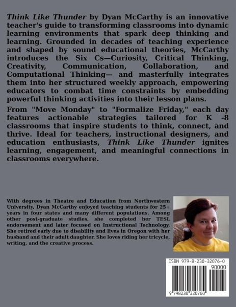 Sales Description: Think Like Thunder by Dyan McCarthy is an innovative guide to transforming classrooms into dynamic learning environments that spark deep thinking and learning. Grounded in over 25 years of teaching experience and shaped by sound educational theories, this book introduces the Six Cs-Curiosity, Critical Thinking, Creativity, Communication, Collaboration, and Computational Thinking-and masterfully integrates them into a simple, effective weekly plan. McCarthy's structured weekly approach empowers educators to combat time constraints by embedding powerful thinking activities into their lesson plans. From "Move Monday" to "Formalize Friday," each day features actionable strategies tailored for K-8 classrooms that inspire students to think, connect, and thrive. Ideal for teachers, instructional designers, and education enthusiasts, Think Like Thunder ignites learning, engagement, and meaningful connections in classrooms everywhere.