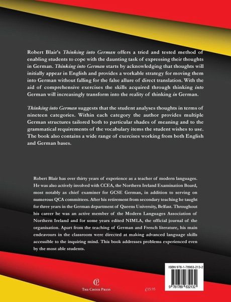 Robert Blair's Thinking into German offers a tried and tested method of enabling students to cope with the daunting task of expressing their thoughts in German. Thinking into German starts by acknowledging that thoughts will initially appear in English and provides a workable strategy for moving them into German without falling for the false allure of direct translation. With the aid of comprehensive exercises the skills acquired through thinking into German will increasingly transform into the reality of thinking in German. Thinking into German suggests that the student analyses thoughts in terms of nineteen categories. Within each category the author provides multiple German structures tailored both to particular shades of meaning and to the grammatical requirements of the vocabulary items the student wishes to use. The book also contains a wide range of exercises working from both English and German bases.