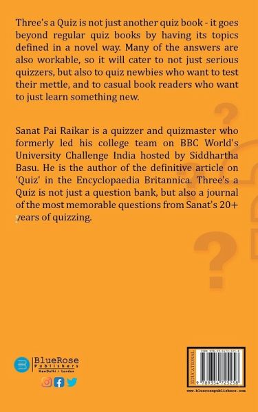 Three's a Quiz is not just another quiz book - it goes beyond regular quiz books by having its topics defined in a novel way. Many of the answers are also workable, so it will cater to not just serious quizzers, but also to quiz newbies who want to test their mettle, and to casual book readers who want to just learn something new.