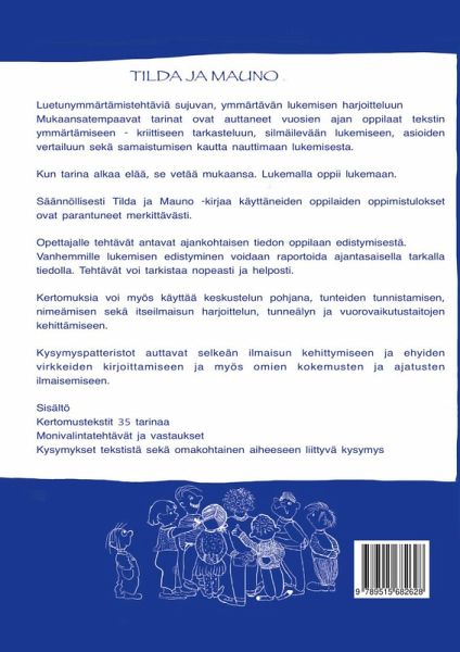 Tilda ja Mauno luetunymmärtämistehtäväkirja on sujuvan ja ymmärtävän lukemisen harjoitteluun. Mukaansatempaavat tarinat auttavat lukijan tekstin ymmärtämiseen ja samaistumisen kautta myös nauttimaan lukemisesta. Monivalintatehtävät harjoittavat luetun tekstin kriittistä tarkastelua, asioiden ja sanojen vertailua. Oikeita vastauksia etsiessään lukija harjaantuu silmäilevään lukemiseen, mutta myös tarkkaan lauseiden ja sanojen loppun asti lukemiseen. Kun tarina alkaa elää se vetää mukaansa. Lukemalla oppii lukemaan. Tilda ja Mauno -kirja kertoo kahden koululaisen elämästä, heidän kavereistaan ja koulusta. Koululaisen ilot ja surut nostavat välillä tunteet pintaan. Kukin luku sisältää tarinan, jossa ehtii tapahtua monia käänteitä, yllätyksiä ja harmejakin. Säännöllisesti kirjaa käyttäneiden oppimistaidot ovat parantuneet merkittävästi. Palaute on ollut hyvin positiivista. Tehtävät antavat ajankohtaisen tiedon oppilaan lukemisen edistymisestä. Tehtävät voi tarkistaa nopeasti ja helposti. Kertomuksia voi käyttää myös keskustelun pohjana, tunteiden tunnistamisen, nimeämisen sekä itseilmaisun harjoittelun, tunneälyn ja vuorovaikutustaitojen kehittämiseen. Kysymyspatteristot auttavat ehyiden virkkeiden kirjoittamiseen ja selkeän kirjallisen ilmaisun kehittymiseen sekä myös omien kokemusten ja ajatusten ilmaisemiseen. Kirja sisältää 35 kertomustekstiä, monivalintatehtävät ja vastaukset sekä kysymykset teksteistä sisältäen omakohtaisen aiheeseen liittyvän kysymyksen.