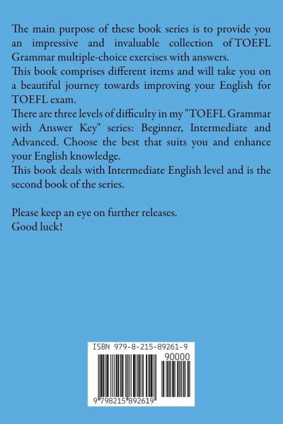 The main purpose of these book series is to provide you an impressive and invaluable collection of TOEFL Grammar multiple-choice exercises with answers. This book comprises different items and will take you on a beautiful journey towards improving your English for TOEFL exam. There are three levels of difficulty in my "TOEFL Grammar with Answer Key" series: Beginner, Intermediate and Advanced. Choose the best that suits you and enhance your English knowledge. This book deals with Intermediate English level and is the second book of the series. Please keep an eye on further releases. Good luck!