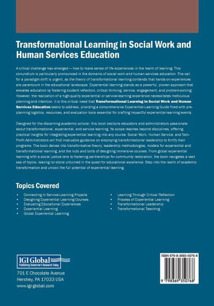 A critical challenge has emerged- how to make sense of life experiences in the realm of learning. This conundrum is particularly pronounced in the domains of social work and human services education. The call for a paradigm shift is urgent, as the theory of transformational learning contends that hands-on experiences are paramount in the educational landscape. Experiential learning stands as a powerful, proven approach that elevates education by fostering student reflection, critical thinking, service, engagement, and problem-solving. However, the realization of a high-quality experiential or service-learning experience necessitates meticulous planning and intention. It is this critical need that Transformational Learning in Social Work and Human Services Education seeks to address, providing a comprehensive Experiential-Learning Guide filled with pre-planning logistics, resources, and evaluation tools essential for crafting impactful experiential-learning events. Designed for the discerning academic scholar, this book beckons educators and administrators passionate about transformational, experiential, and service learning. Its scope reaches beyond disciplines, offering practical insights for integrating experiential learning into any course. Social Work, Human Service, and Non-Profit Administrators will find invaluable guidance on employing transformational leadership to fortify their programs. The book delves into transformative theory, leadership methodologies, models for experiential and transformational learning, and the nuts and bolts of designing immersive courses. From global experiential learning with a social justice lens to fostering partnerships for community restoration, the book navigates a vast sea of topics, leaving no stone unturned in the quest for educational excellence. Step into the realm of academic transformation and unlock the full potential of experiential learning.