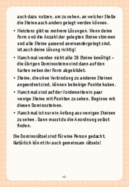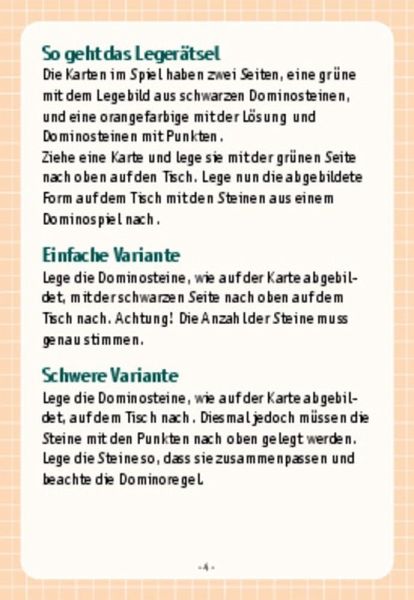 Ein Haus, eine Spirale oder andere geometrische Figuren aus Dominos nachlegen und dabei die Punkte auf den Steinen beachten: Wie lässt sich die Figur legen und zugleich das Dominoprinzip einhalten? Die Aufgabenstellung auf den Rätselkarten ist einfach - die Ausführung erfordert Konzentration und ein gutes Auge! Die 30 Knobelaufgaben sind die perfekte Beschäftigung, wenn Stille gefordert ist und die grauen Zellen trainiert werden sollen.