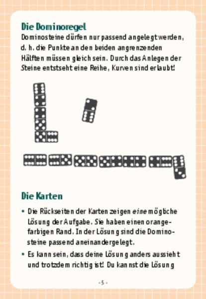 Ganz schön knifflig! Bei diesem Kartenset spielen Mustererkennung und Zahlenvorstellung eine große Rolle. Ob in der Nachmittagsbetreuung, im Unterricht oder zwischendrin, wenn gerade Zeit ist, lässt sich eine der kurzen Rätselaufgaben einschieben. Dabei gilt es die unterschiedlichen Formen und Figuren auf den Karten mit Dominosteinen nachzulegen. Aber aufgepasst: Die Punkte zweier nebeneinander liegender Steine müssen entsprechend dem Domino-Prinzip ebenfalls zueinander passen.