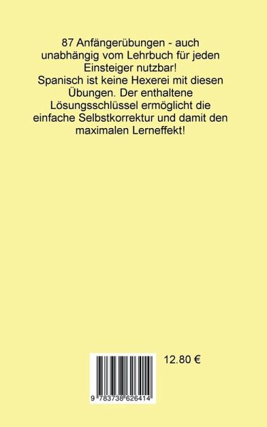 87 Spanisch-Anfängerübungen - auch unabhängig vom Lehrbuch für jeden Einsteiger nutzbar!Spanisch ist keine Hexerei, mit diesen 87 Übungen. Der enthaltene Lösungsschlüssel ermöglicht die einfache Selbstkorrektur, und damit den maximalen Lerneffekt!
