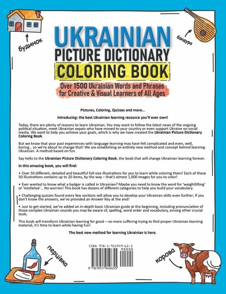 Pictures, Coloring, Quizzes and more... Introducing: the best Ukrainian learning resource you'll ever own! Today, there are plenty of reasons to learn Ukrainian. You may want to follow the latest news of the ongoing political situation, meet Ukrainian expats who have moved to your country or even support Ukraine on social media. We want to help you achieve your goals, which is why we have created the Ukrainian Picture Dictionary Coloring Book. But we know that your past experiences with language learning may have felt complicated and even, well, boring... so we're about to change that! We are establishing an entirely new method and concept behind learning Ukrainian. A method based on fun. Say hello to the Ukrainian Picture Dictionary Coloring Book, the book that will change Ukrainian learning forever. In this amazing book, you will find: · Over 50 different, detailed and beautiful full-size illustrations for you to learn while coloring them! Each of these 50 illustrations contains up to 20 items, by the way - that's almost 1,000 images for you to color! · Ever wanted to know what a badger is called in Ukrainian? Maybe you need to know the word for 'weightlifting' or 'mistletoe'... No worries! This book has dozens of different categories to help you build your vocabulary. · Challenging quizzes found every few sections will allow you to develop your Ukrainian skills even further; if you don't know the answers, we've provided an Answer Key at the end! · Just to get started, we've added an in-depth basic Ukrainian guide at the beginning, including pronunciation of those complex Ukrainian sounds you may be aware of, spelling, word order and vocabulary, among other crucial tools. This book will transform Ukrainian learning for good - no more suffering trying to find proper Ukrainian learning material, it's time to learn while having fun! The best new method for learning Ukrainian is here. Get the Ukrainian Picture Dictionary Coloring Book now!