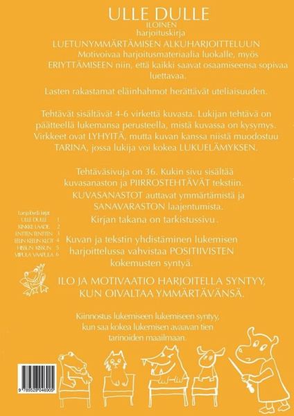 ULLE DULLE iloinen harjoituskirja on tarkoitettu luetunymmärtämisen alkuharjoitteluun. Motivoivaa harjoitusmateriaalia luokalle, myös eriyttämiseen, niin, että kaikki saavat osaamiseensa sopivaa luettavaa. Kirjan kuvituksessa lasten rakastamat eläinhahmot herättävät uteliaisuuden lukemiseen. Tehtävät sisältävät lyhyitä virkkeitä. Lukijan tehtävä on päätellä lukemansa perusteella mistä kuvassa on kysymys. Tehtäviin liittyvät kuvasanastot ja piirrostehtävät.