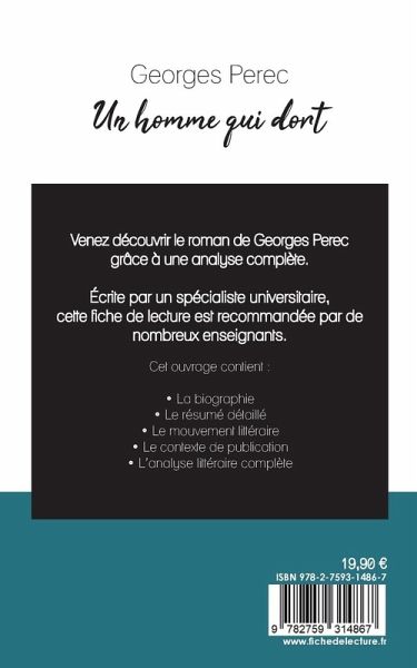 Venez découvrir Un homme qui dort de Georges Perec grâce à une analyse littéraire de référence ! Écrite par un spécialiste universitaire, cette fiche de lecture est recommandée par de nombreux enseignants. Cet ouvrage contient la biographie de l'écrivain, le résumé détaillé, le mouvement littéraire, le contexte de publication de l'oeuvre et l'analyse complète. Retrouvez tous nos titres sur : www.fichedelecture.fr.