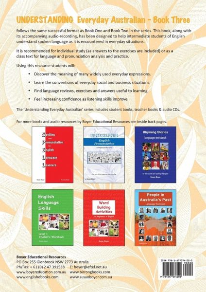 'Understanding Everyday Australian - Book Three', authored by Susan Boyer, is part of a 3 book series which includes student and teacher books and audio resources. These resources explain contemporary Australian language and they are enjoyable and easy to use. They incorporate widely used everyday Australian expressions, pronunciation and practical hints for general conversation. It is also for those teaching English grammar, pronunciation, speaking and listening skills. 'Understanding Everyday Australian' has been designed for students who have reached an intermediate level of Australian language proficiency as a guide to Australian language as it is spoken in everyday situations. It is also recommended for individual study as answers to exercises are included.