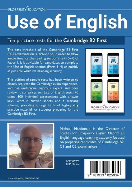 This edition of sample tests has been written to closely replicate the Cambridge exam experience, and has undergone rigorous expert and peer review. It comprises ten Use of English tests, 40 texts, 300 individual assessments with answer keys, write-in answer sheets and a marking scheme, providing a large bank of high-quality practice material for students preparing for the Cambridge B2 First. Each print-ready test comprises: Part 1: Multiple choice cloze Part 2: Open close Part 3: Word formation Part 4: Key word transformations Michael Macdonald is the Director of Studies for Prosperity English Madrid, an English-language teaching academy focused on preparing candidates of Cambridge B2, C1 and C2 examinations.