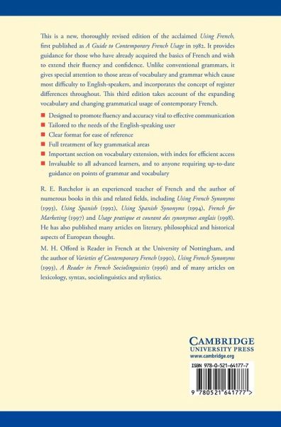 This book was first published in 2000 and is a thoroughly revised edition of the acclaimed Using French, first published as A Guide to Contemporary French Usage in 1982. It provides guidance for those who have already acquired the basics of French and wish to extend their fluency and confidence. Unlike conventional grammars, it gives special attention to those areas of vocabulary and grammar which cause most difficulty to English-speakers, and incorporates the concept of register differences throughout. This third edition takes account of the expanding vocabulary and changing grammatical usage of contemporary French. ¿ Designed to promote fluency and accuracy vital to effective communication ¿ Tailored to the needs of the English-speaking user ¿ Clear format for ease of reference ¿ Full treatment of key grammatical areas ¿ Important section on vocabulary extension, with index for efficient access ¿ Invaluable to all advanced learners, and to anyone requiring up-to-date guidance on points of grammar and vocabulary