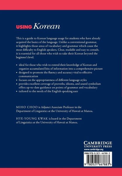 This is a guide to Korean language usage for students who have already acquired the basics of the language and wish to extend their knowledge and organise accumulated bits of information into a comprehensive picture. It is designed to promote the fluency and accuracy vital to effective communication, provides excellent coverage of proverbs, idioms, and sound symbolism, is tailored to the needs of the English-speaking user, and will be invaluable to anyone requiring up-to-date guidance on points of grammar and vocabulary. Unlike conventional grammars, it highlights those areas of vocabulary and grammar which cause most difficulty to English speakers. Special attention is given throughout the book to the appropriateness of different language styles in various situational contexts. Clear, readable, and easy to consult, it is essential for all those who wish to take their Korean beyond the beginner's level.