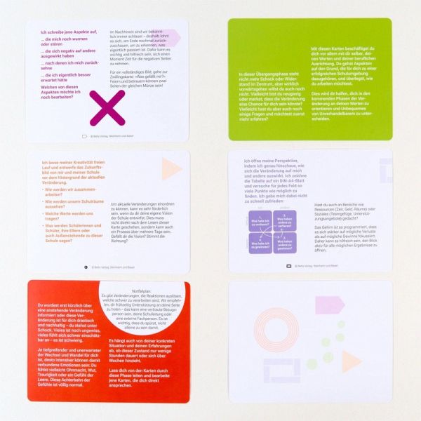 Wenn sich Bestehendes verändert oder Neues eingeführt wird, hat dies Auswirkungen auf das persönliche Befinden. Lehrpersonen, Mitarbeitende und Führungspersonen fühlen sich angesichts von Veränderungsprozessen an Schulen oft herausgefordert oder zeitweise sogar überfordert. Gleichzeitig können diese Situationen neue Möglichkeiten aufzeigen. Hier setzt das Kartenset an. Die 48 Karten helfen, die aktuelle Situation zu reflektieren und individuelle Orientierung zu finden. Sie halten konkrete Ansatzpunkte und Handlungsoptionen bereit, um selbstwirksam mit Veränderung umzugehen.Die ansprechend gestalteten Karten leiten pointiert mit Herz, Hand und Verstand übersichtlich durch die Phasen von Veränderungsprozessen. Sie sind direkt anwendbar und für das Selbstcoaching konzipiert, können aber auch zu zweit, in der Teamarbeit oder in Coaching und Beratung eingesetzt werden.