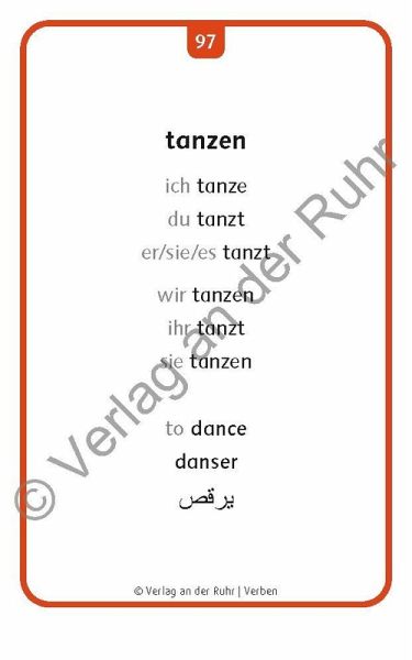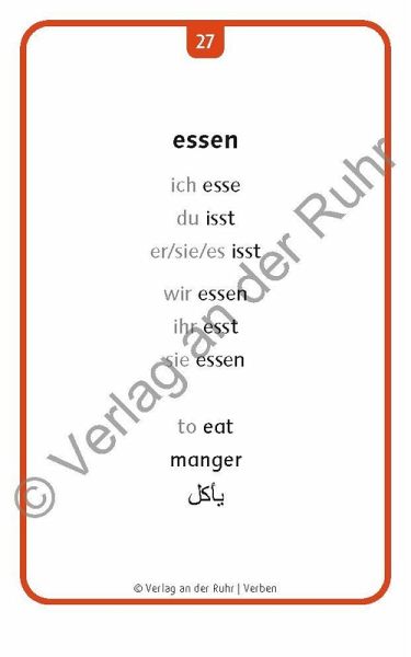 Bildkarten für Lehrer, Lehrerinnen und Sprachförderkräfte in der Kita, an Schulen sowie für außerschulische Lehrkräfte, Fach: Deutsch als Zweitsprache/Fremdsprache (DaZ/DaF), geeignet für alle Altersstufen, Sprachniveau A1 +++Die Arbeit am Wortschatz ist entscheidend für den erfolgreichen Spracherwerb. Egal ob Kinder oder Erwachsene Deutsch lernen, ob in der Kita oder in Integrationsklassen an der Schule, in Integrationskursen oder zu Hause - mit diesen flexibel einsetzbaren Bildkarten können Sie Ihren Lernenden den Einstieg in die deutsche Sprache erleichtern.Das Kartenset beinhaltet die 120 wichtigsten Verben, die den Einstieg in die deutsche Sprache erleichtern:Auf der Vorderseite ist jeweils ein Bild abgedruckt.Auf der Rückseite wird der Begriff in vier Sprachen (Deutsch, Englisch, Französisch, Arabisch) benannt.Zusätzlich werden die Verben auf Deutsch im Präsens konjugiert.So sind die Karten perfekt geeignet für die Sprachförderung beim Erwerb von Deutsch als Zweitsprache.Kurze Anwendungstipps runden das Set ab und zeigen vielfältige Einsatzmöglichkeiten zum Vokabellernen, Sprechen und Zuhören auf. Daneben finden Sie ausführliche Ideen zu Übungen, Spielen u. v. m. im Download.