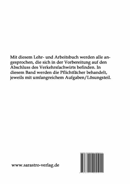 Aus der bewährten Reihe "Das prüfungsrelevante Wissen" richtet sich dieses "Lehr- und Arbeitsbuch" an alle, die sich optimal und zielgerichtet auf die Abschlussprüfung zum Verkehrsfachwirt vorbereiten möchten. Ausgestattet mit einem umfangreichen Aufgaben- und Lösungsteil werden die Pflichtfächer Kaufmännische Steuerung und Personalwirtschaft, Verkehrswirtschaft und Verkehrsdienstleistungen sowie Führung, Kommunikation und Kooperation behandelt.