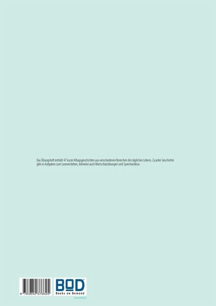 Das Übungsheft enthält 47 kurze Alltagsgeschichten aus verschiedenen Bereichen des täglichen Lebens. Zu jeder Geschichte gibt es Aufgaben zum Leseverstehen, teilweise auch Wortschatzübungen und Sprechanlässe.